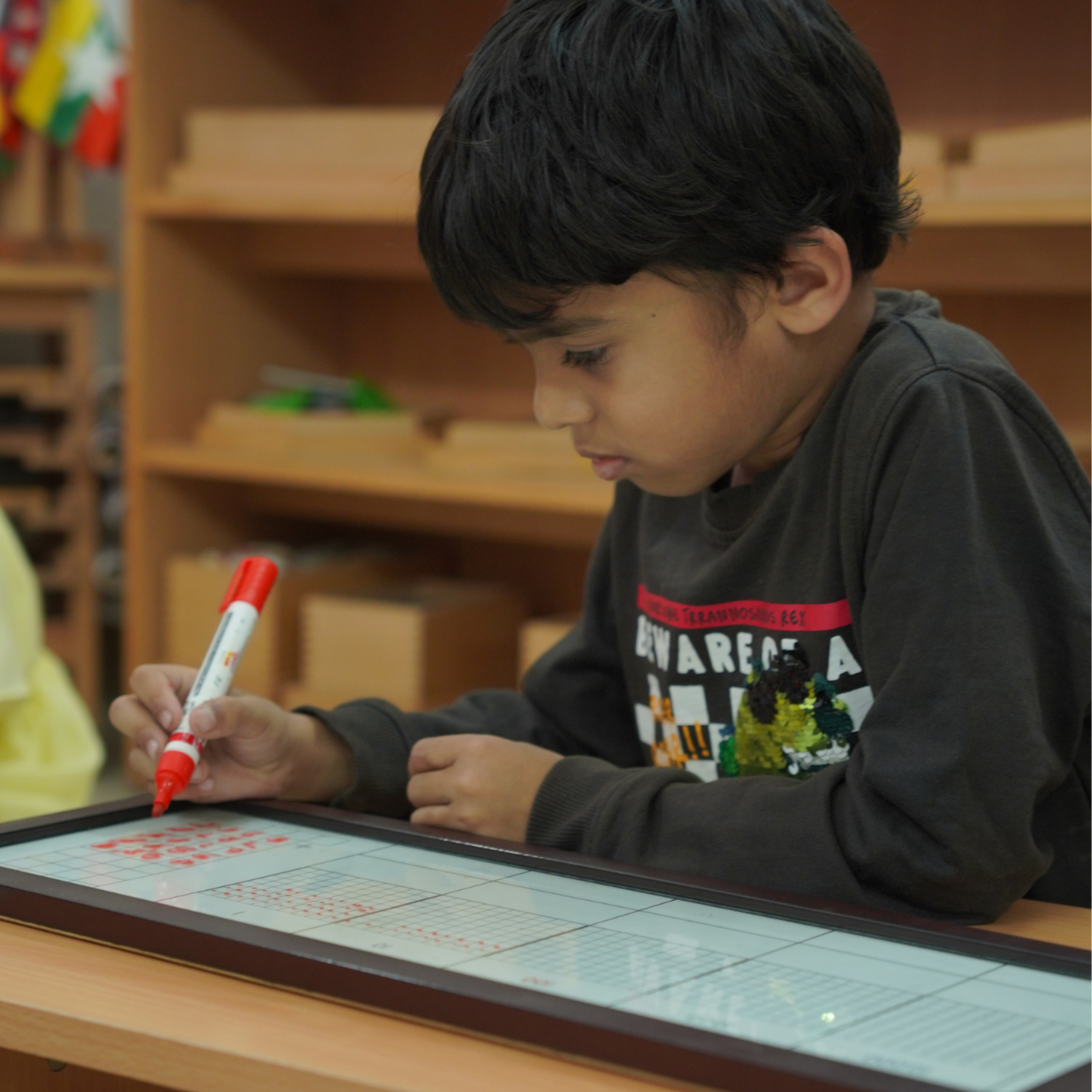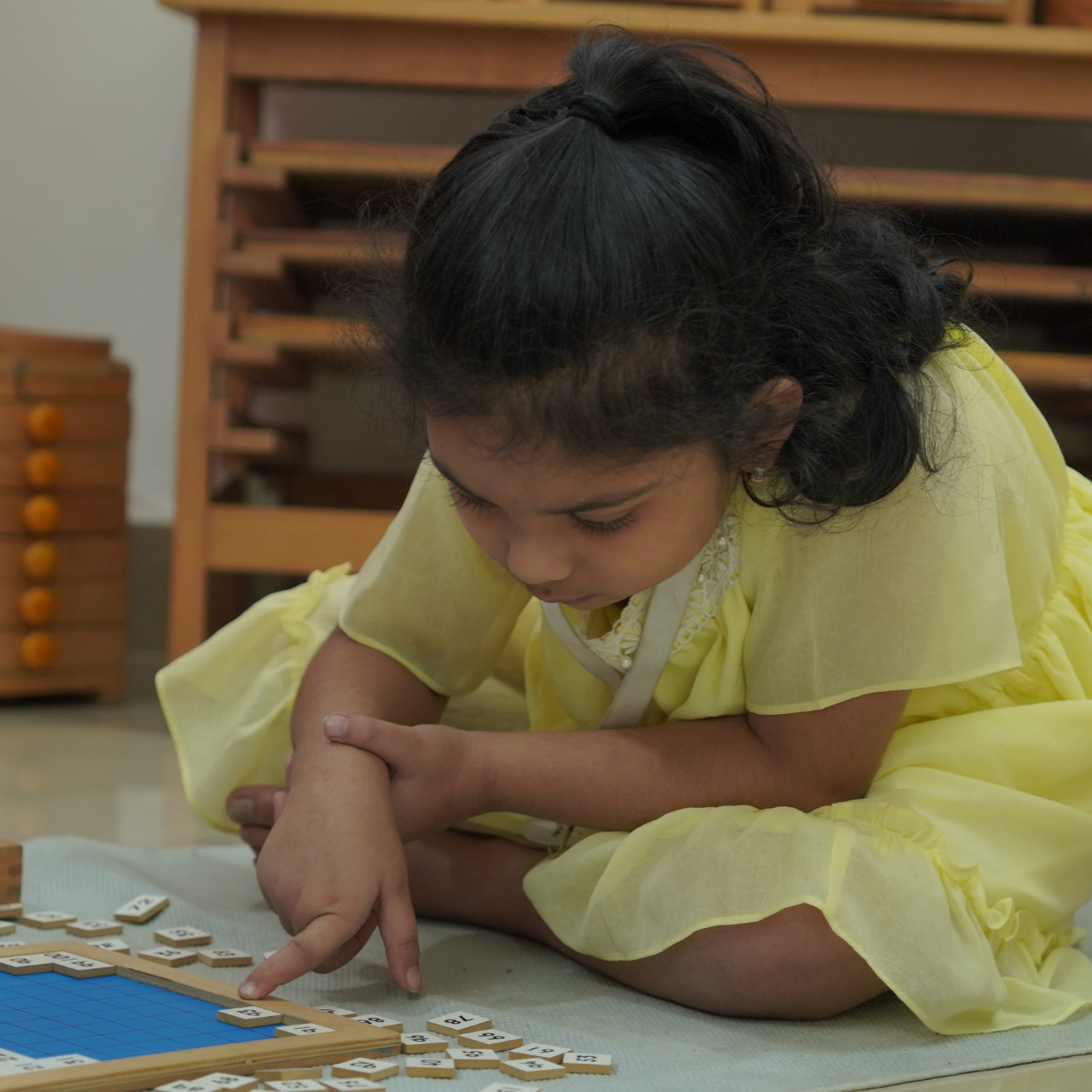 Arithmetic material developed by Montessori are a work of a genius. They help children appreciate abstract concepts by showing them in a concrete form. The child gets familiar with numbers, the decimal system, get a better understanding on how numbers work. They eventually get introduced to 4 arithmetic operations across hierarchies and levels. This leads to a strong understanding of mathematical concepts, which will help the child in future. Once the concepts are clear and as the child progresses we help them move from concrete to abstract. Here, as in other areas, emphasis is on understanding the concepts